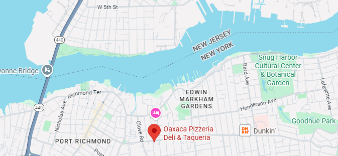Oaxaca Pizzeria Deli & Taqueria is located on the North shore of Staten Island, between Snug Harbor and the Bayonne Bridge — at 1240 Castleton Avenue.