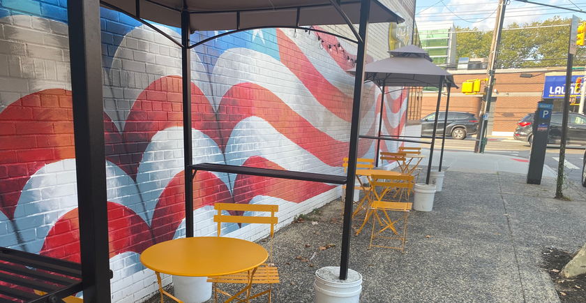 The photo below was taken several years ago to show the ingenuity of using buckets of sand for the base of outside umbrellas, temporarily installed during COVID outside the old Sedutto’s building (now “Something Sweet”) on Clawson Street and New Dorp Lane.